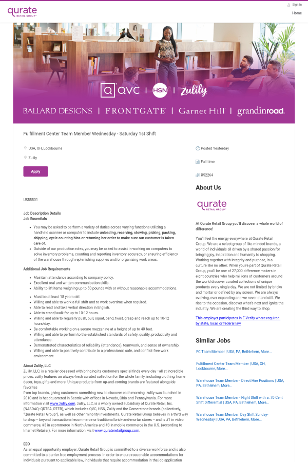 As an equal opportunity employer, Qurate Retail Group is committed to a diverse workforce and is also committed to a barrier-free employment process. In order to ensure reasonable accommodations for individuals pursuant to applicable law, individuals that require accommodation in the job application process for a posted position may contact us at CareersUS@QVC.com for assistance.