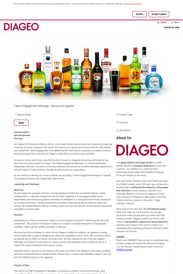 Our goal is to be a world class recruiting function focused on engaging, attracting and hiring the very best and most diverse talent for Diageo. The Talent Engagement Manager is a critical stakeholder relationship role that is focused on ensuring consistent delivery and an excellent candidate experience to achieve Diageo’s Talent Ambition, through all hiring across our organisation.