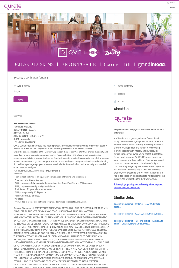 QVC’s Operations and Services has exciting opportunities for talented individuals to become Security Assistants in the On Call Program of our Security department at our Florence location.