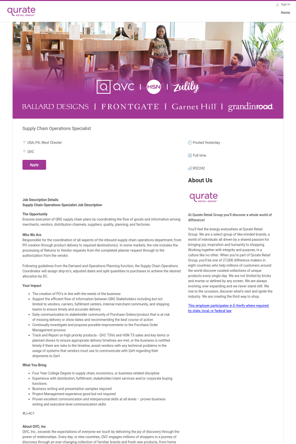As an equal opportunity employer, Qurate Retail Group is committed to a diverse workforce and is also committed to a barrier-free employment process. In order to ensure reasonable accommodations for individuals pursuant to applicable law, individuals that require accommodation in the job application process for a posted position may contact us at CareersUS@QVC.com for assistance.