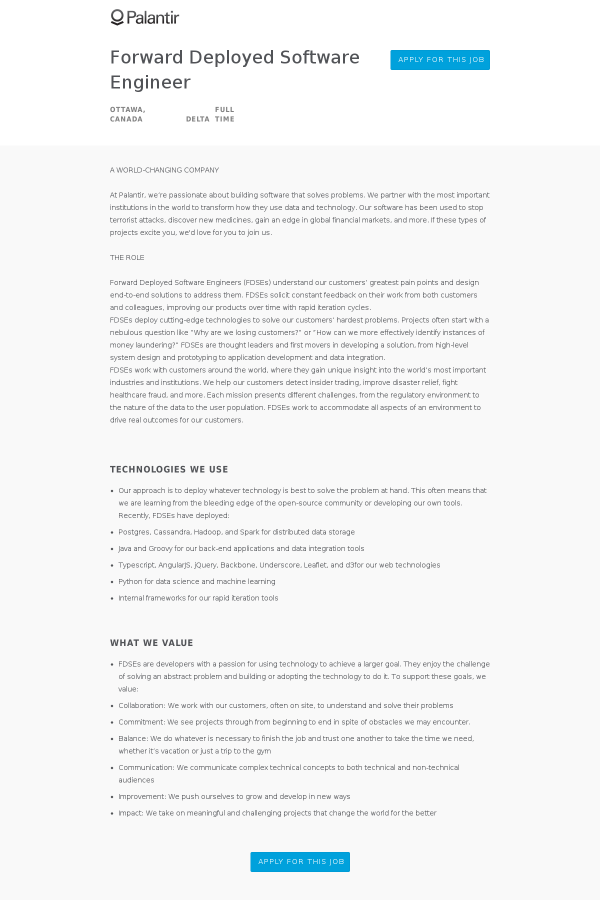 At Palantir, we’re passionate about building software that solves problems. We partner with the most important institutions in the world to transform how they use data and technology. Our software has been used to stop terrorist attacks, discover new medicines, gain an edge in global financial markets, and more. If these types of projects excite you, we'd love for you to join us.