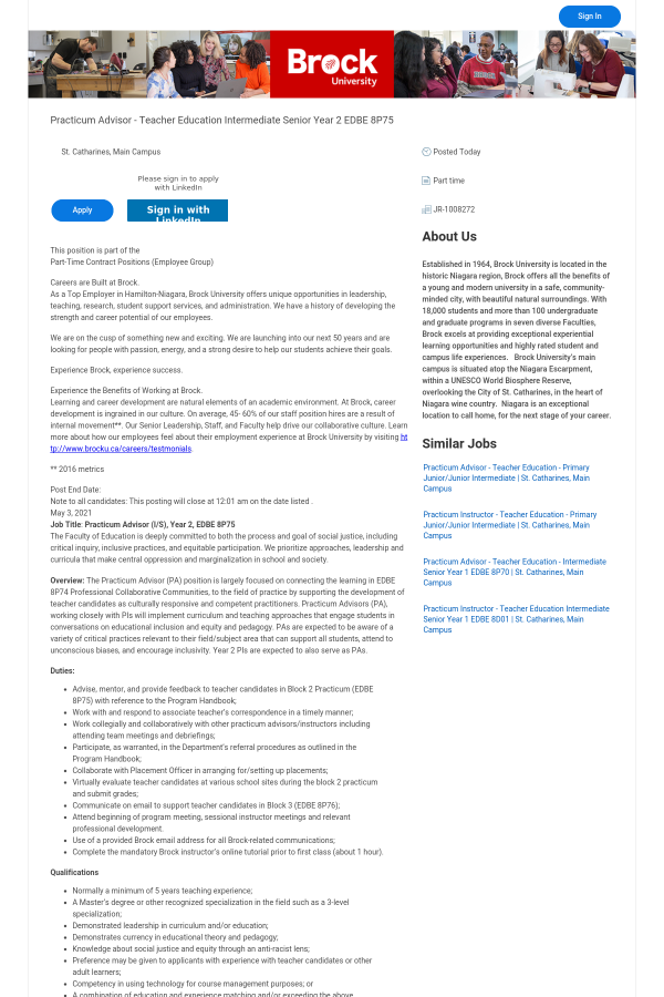 It is Brock University’s policy to give consideration to qualified internal applicants.