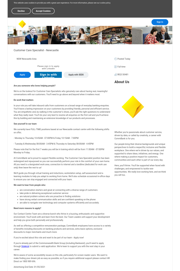 We're aware of some accessibility issues on this site, particularly for screen reader users. We want to make finding your dream job as easy as possible, so if you require additional support please contact HR Direct on 1800 989 696.