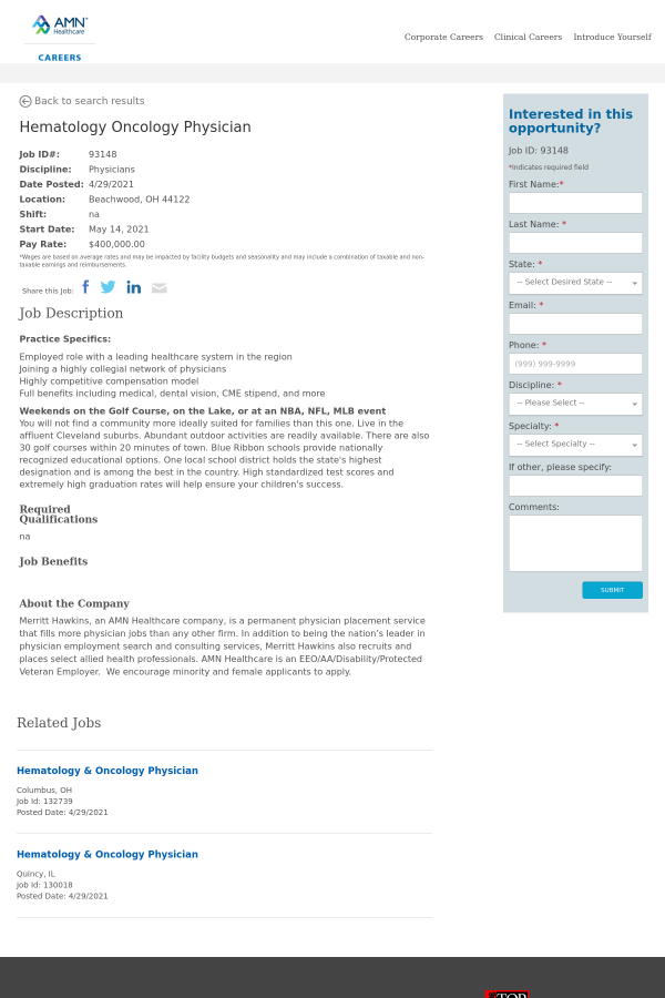 Merritt Hawkins, an AMN Healthcare company, is a permanent physician placement service that fills more physician jobs than any other firm. In addition to being the nation’s leader in physician employment search and consulting services, Merritt Hawkins also recruits and places select allied health professionals. AMN Healthcare is an EEO/AA/Disability/Protected Veteran Employer. We encourage minority and female applicants to apply.