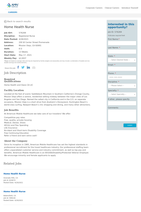 Since its inception in 1985, American Mobile Healthcare has set the highest standards in professional recruitment for the travel healthcare industry. Our professional staffing team offers unparalleled customer service and industry commitment, as well as top pay and benefits. American Mobile Healthcare is an EEO/AA/Disability/Protected Veteran Employer. We encourage minority and female applicants to apply