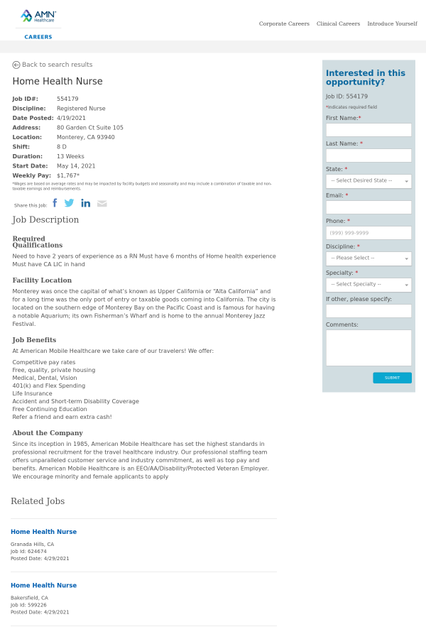 Since its inception in 1985, American Mobile Healthcare has set the highest standards in professional recruitment for the travel healthcare industry. Our professional staffing team offers unparalleled customer service and industry commitment, as well as top pay and benefits. American Mobile Healthcare is an EEO/AA/Disability/Protected Veteran Employer. We encourage minority and female applicants to apply