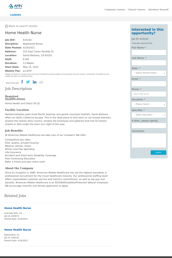Since its inception in 1985, American Mobile Healthcare has set the highest standards in professional recruitment for the travel healthcare industry. Our professional staffing team offers unparalleled customer service and industry commitment, as well as top pay and benefits. American Mobile Healthcare is an EEO/AA/Disability/Protected Veteran Employer. We encourage minority and female applicants to apply