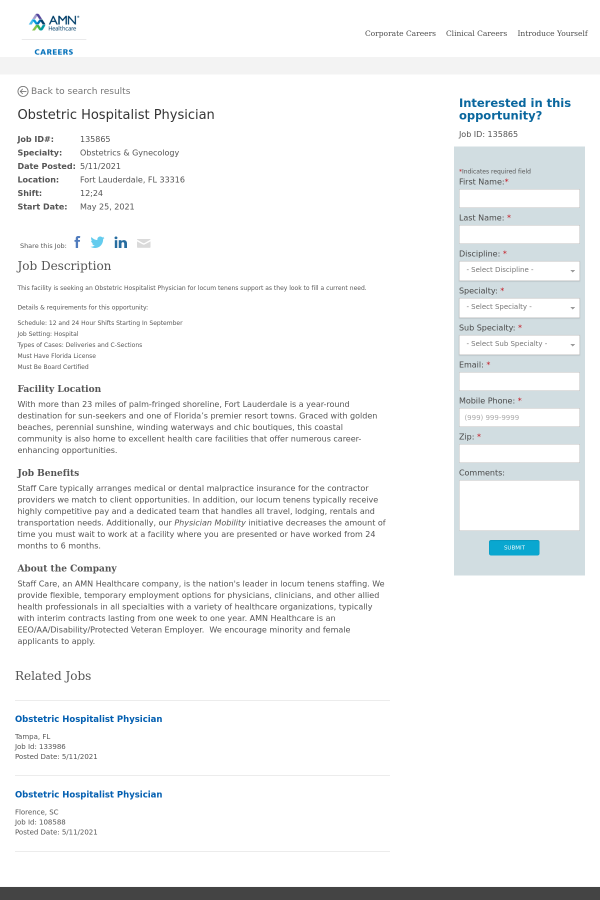 Staff Care, an AMN Healthcare company, is the nation's leader in locum tenens staffing. We provide flexible, temporary employment options for physicians, clinicians, and other allied health professionals in all specialties with a variety of healthcare organizations, typically with interim contracts lasting from one week to one year. AMN Healthcare is an EEO/AA/Disability/Protected Veteran Employer. We encourage minority and female applicants to apply.