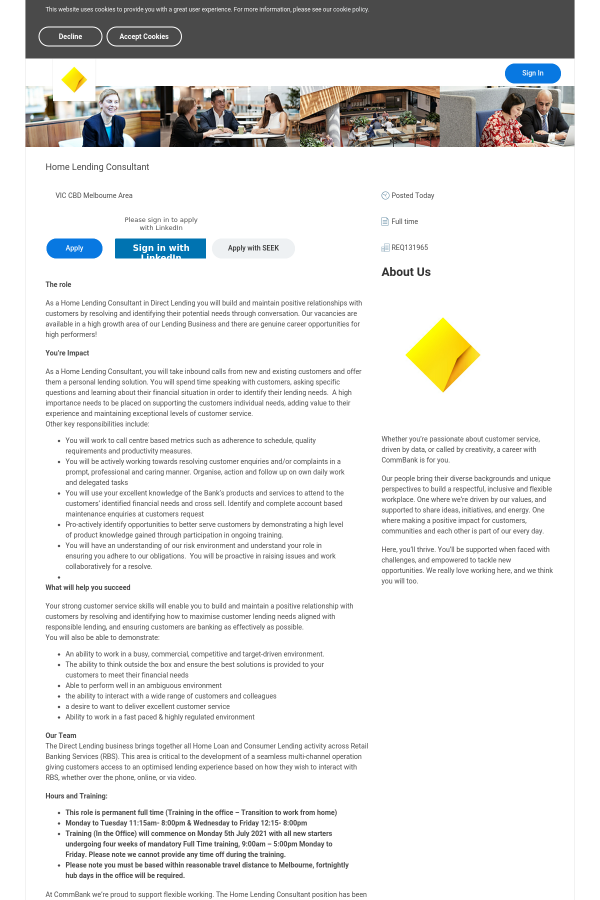As a Home Lending Consultant in Direct Lending you will build and maintain positive relationships with customers by resolving and identifying their potential needs through conversation. Our vacancies are available in a high growth area of our Lending Business and there are genuine career opportunities for high performers!