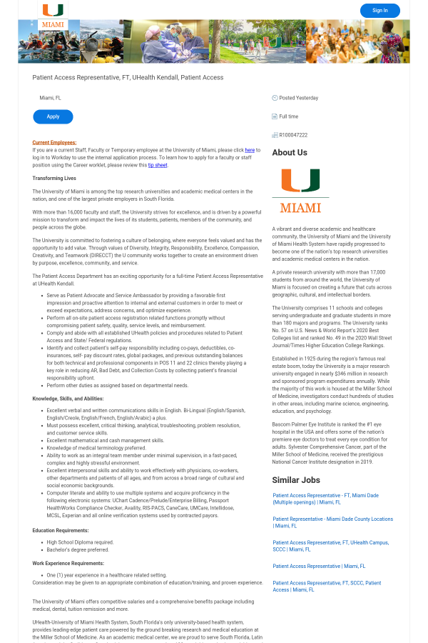 The Patient Access Department has an exciting opportunity for a full-time Patient Access Representative at UHealth Kendall.