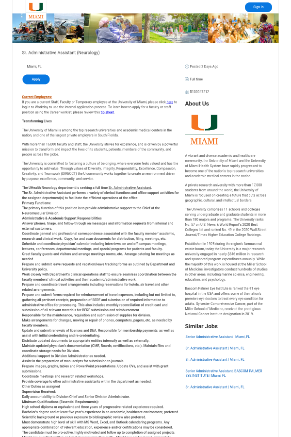 If you are a current Staff, Faculty or Temporary employee at the University of Miami, please click here to log in to Workday to use the internal application process. To learn how to apply for a faculty or staff position using the Career worklet, please review this tip sheet.
