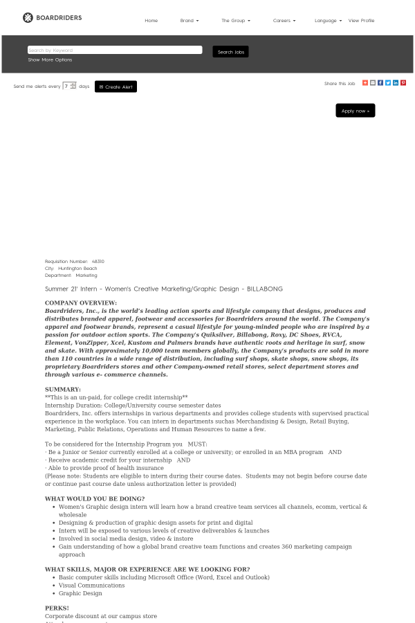 Boardriders, Inc. offers internships in various departments and provides college students with supervised practical experience in the workplace. You can intern in departments suchas Merchandising & Design, Retail Buying, Marketing, Public Relations, Operations and Human Resources to name a few.