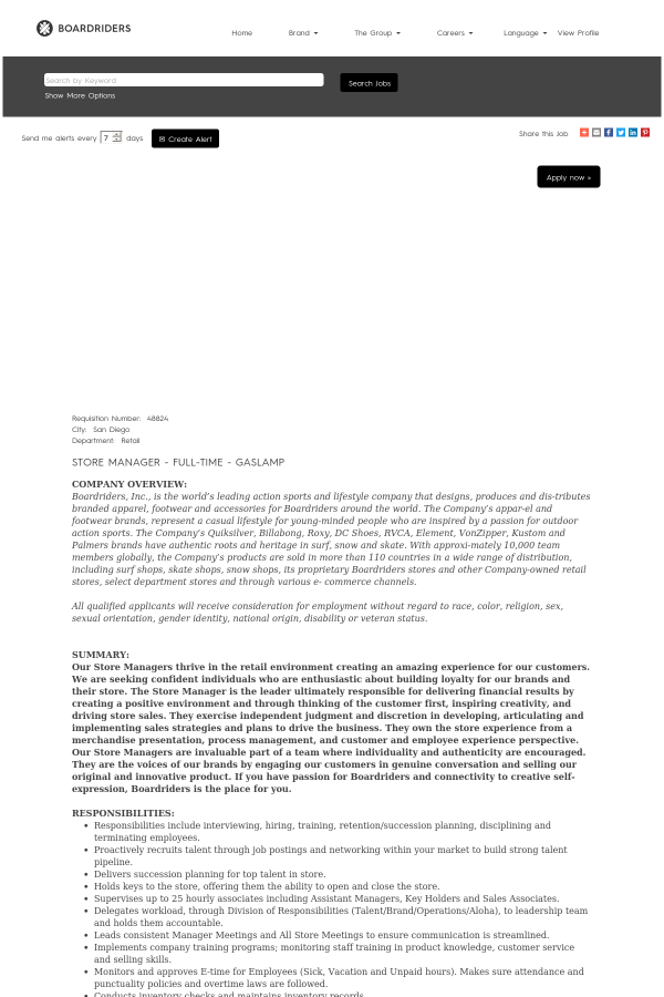 Our Store Managers thrive in the retail environment creating an amazing experience for our customers. We are seeking confident individuals who are enthusiastic about building loyalty for our brands and their store. The Store Manager is the leader ultimately responsible for delivering financial results by creating a positive environment and through thinking of the customer first, inspiring creativity, and driving store sales. They exercise independent judgment and discretion in developing, articulating and implementing sales strategies and plans to drive the business. They own the store experience from a merchandise presentation, process management, and customer and employee experience perspective. Our Store Managers are invaluable part of a team where individuality and authenticity are encouraged. They are the voices of our brands by engaging our customers in genuine conversation and selling our original and innovative product. If you have passion for Boardriders and connectivity to creative self-expression, Boardriders is the place for you.