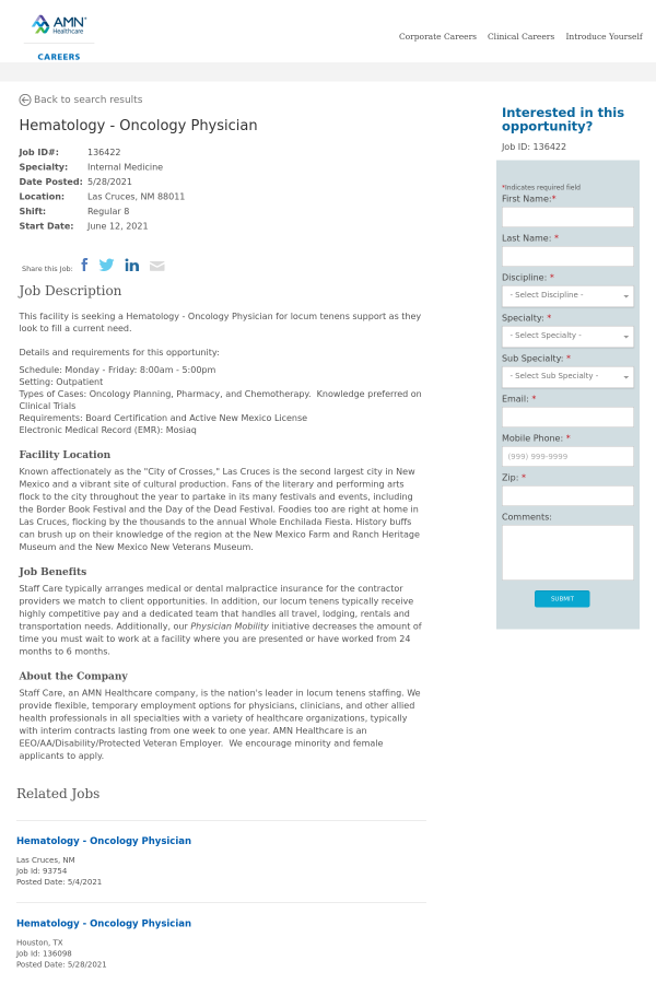 Staff Care, an AMN Healthcare company, is the nation's leader in locum tenens staffing. We provide flexible, temporary employment options for physicians, clinicians, and other allied health professionals in all specialties with a variety of healthcare organizations, typically with interim contracts lasting from one week to one year. AMN Healthcare is an EEO/AA/Disability/Protected Veteran Employer. We encourage minority and female applicants to apply.