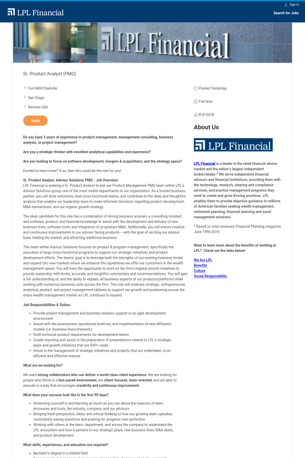 LPL Financial is seeking a Sr. Product Analyst to join our Product Management PMO team within LPL’s Advisor Solutions group, one of the most visible departments in our organization. As a trusted business partner, you will drive outcomes, lead cross-functional teams, and contribute to the deep and thoughtful analysis that enables our leadership team to make informed decisions regarding product development, M&A transactions, and our organic growth strategy.