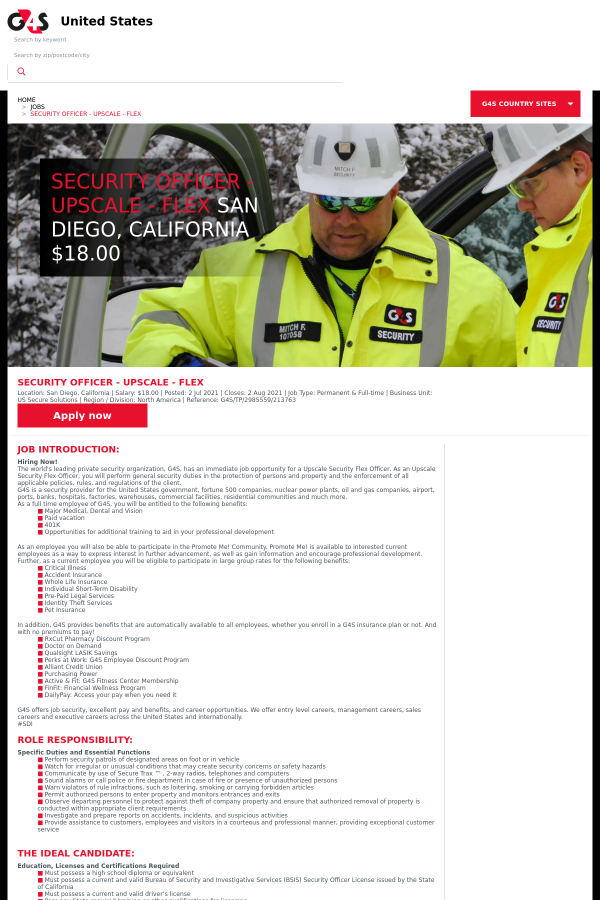 The world's leading private security organization, G4S, has an immediate job opportunity for a Upscale Security Flex Officer. As an Upscale Security Flex Officer, you will perform general security duties in the protection of persons and property and the enforcement of all applicable policies, rules, and regulations of the client.