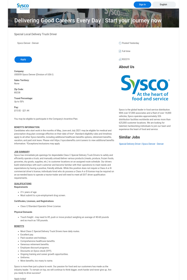 Sysco has immediate job openings for dependable Class C Special Delivery Truck Drivers to safely and efficiently operate a truck, and manually unload/deliver various products (meats, produce, frozen foods, groceries, dry goods, supplies, etc.) to customer locations on an assigned route schedule. Our drivers build relationships with each customer and become familiar with their operations to meet needs and expectations by having a positive, friendly attitude. While this position does not require a Class A or B commercial driver's license, individuals hired who do possess a Class A or B license may be required on an as-needed basis to operate a tractor-trailer and will need to meet all DOT driver qualification requirements.