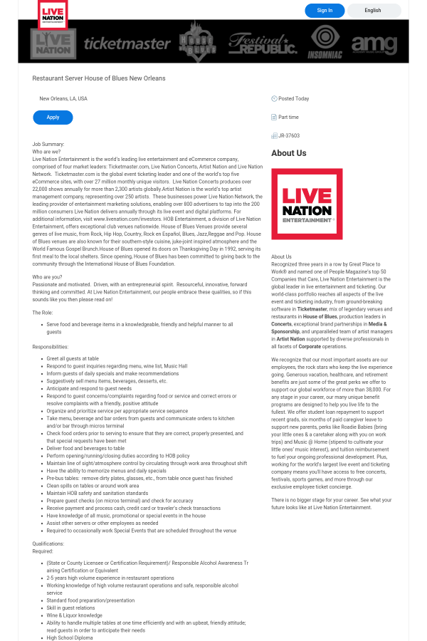 If the above description sounds like you and fits your background, apply online at http://www.livenation.com/careers/index.html to join the Live Nation Entertainment team today!