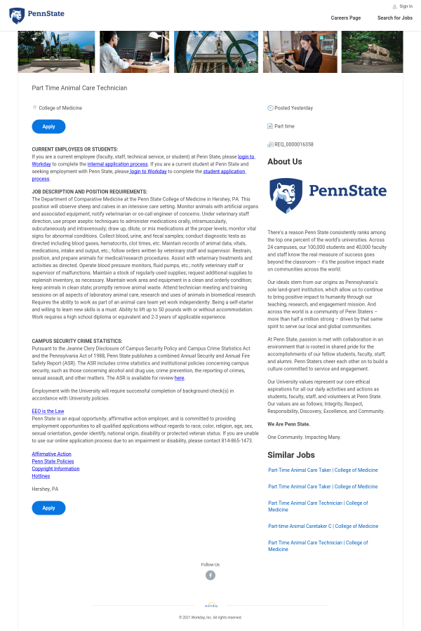 The Department of Comparative Medicine at the Penn State College of Medicine in Hershey, PA has part-time openings within our critical care unit. This position will observe sheep and calves in an intensive care setting. Observe animals in an intensive care setting and report changes to veterinary staff or supervisor; notify on-call veterinarian in emergency situation; as appropriate, take immediate action such as controlling bleeding or seizures, administering oxygen or medication, etc. Monitor animals with artificial organs and associated equipment; react properly to alarms and change in status; notify veterinarian or on-call engineer. Under veterinary staff direction, use proper aseptic techniques to administer medications orally, intramuscularly, and intravenously; draw up, dilute, or mix medications at the proper levels; monitor blood pressure and heart rate for abnormal conditions. Collect blood, urine, and fecal samples; conduct diagnostic tests as directed including blood gases, hematocrits, clot times, etc. Maintain records of animal data, vitals, medications, intake and output, etc.; follow orders written by veterinary staff and supervisor. Restrain, position, and prepare animals for medical/research procedures. Assist with veterinary treatments and activities as directed. Operate and perform routine user maintenance on equipment such as blood pressure monitors, fluid pumps, etc.; notify supervisor of malfunctions. Prepare room for animals returning from surgery; ensure availability of stanchion with clean mat, oxygen tank, and other equipment/supplies required for animal recovery. Maintain a stock of regularly used supplies; request additional supplies to replenish inventory, as necessary; make recommendations to supervisor when new equipment and supplies may be needed. Maintain work area and equipment in a clean and orderly condition; keep animals in clean state; promptly remove animal waste. Attend technician meeting and training sessions on all aspects of laboratory animal care, research and uses of animals in biomedical research. Requires the ability to work as part of an animal care team yet work independently. Being a self-starter and willing to learn new skills is a must. Ability to lift up to 50 pounds with or without accommodation.