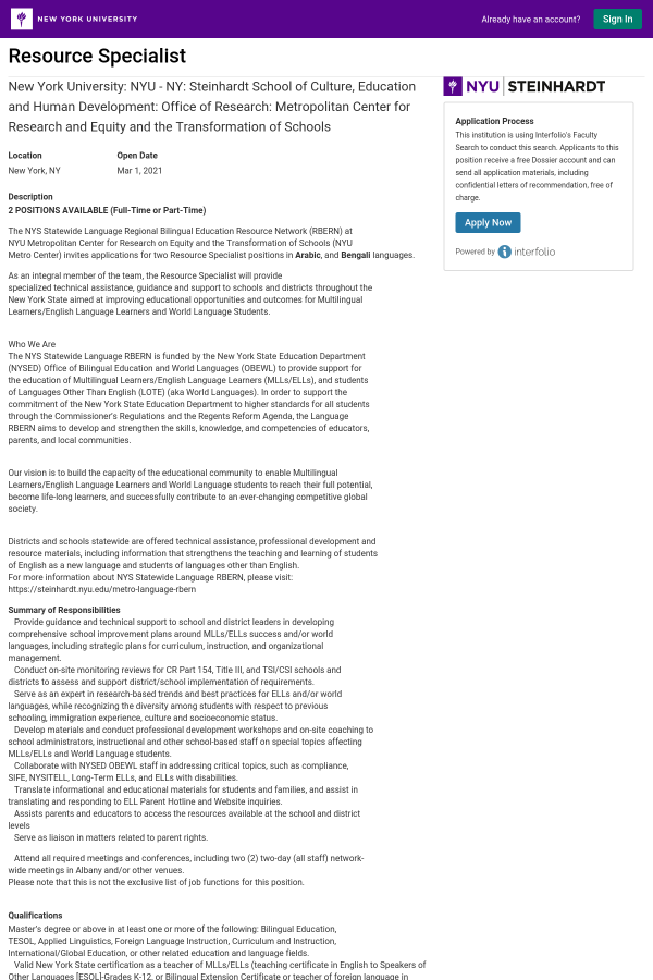 The NYS Statewide Language Regional Bilingual Education Resource Network (RBERN) at NYU Metropolitan Center for Research on Equity and the Transformation of Schools (NYU Metro Center) invites applications for two Resource Specialist positions, with priorities given to Arabic and Bengali language specialists.