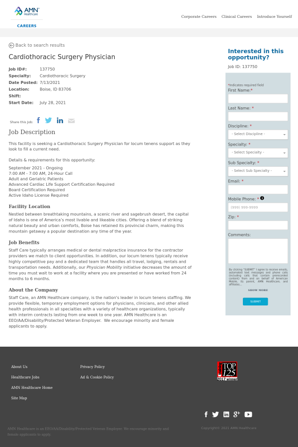 Staff Care, an AMN Healthcare company, is the nation's leader in locum tenens staffing. We provide flexible, temporary employment options for physicians, clinicians, and other allied health professionals in all specialties with a variety of healthcare organizations, typically with interim contracts lasting from one week to one year. AMN Healthcare is an EEO/AA/Disability/Protected Veteran Employer. We encourage minority and female applicants to apply.