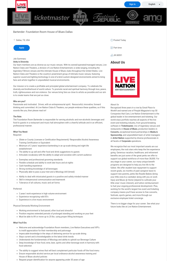 If the above description sounds like you and fits your background, apply online at http://www.livenation.com/careers/index.html to join the Live Nation Clubs and Theaters team today!