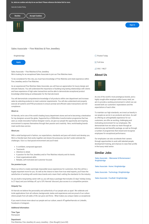As an experienced Fine Watches Sales Associate, you will have an appreciation for luxury design and intricate features. You will understand the importance of building long lasting relationships with clients and have experience of high sales transactions and be able to demonstrate exceptional product knowledge whilst being an ambassador for the Harrods brand.