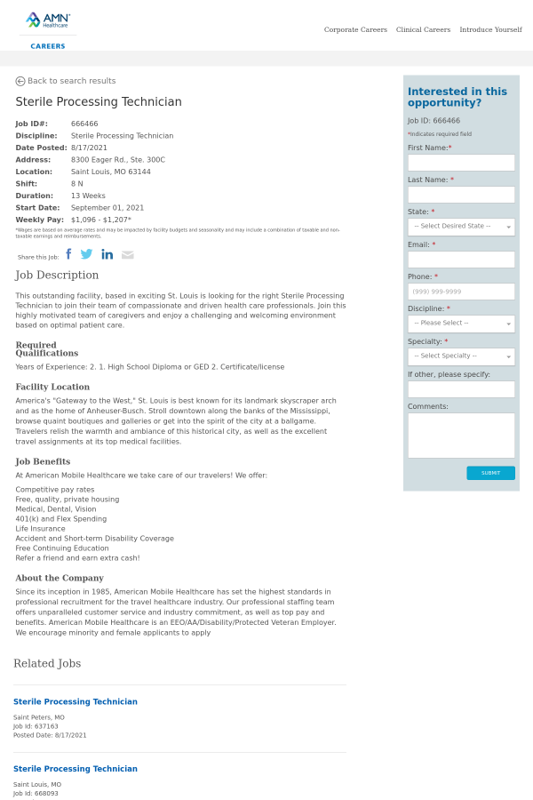 This outstanding facility, based in exciting St. Louis is looking for the right Sterile Processing Technician to join their team of compassionate and driven health care professionals. Join this highly motivated team of caregivers and enjoy a challenging and welcoming environment based on optimal patient care.