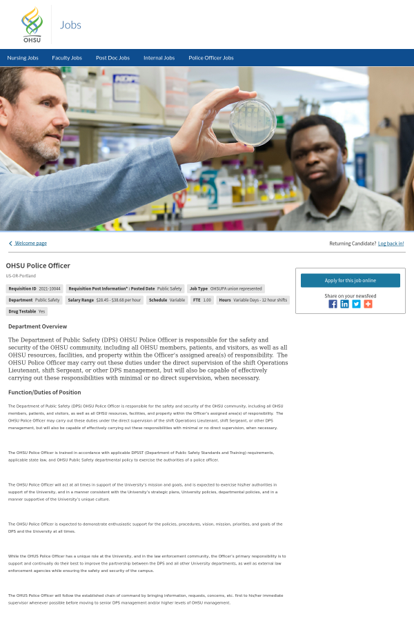- Criminal history free of any disqualifying offenses listed by the DPSST for certification by the state of Oregon, and any OHSU requirements