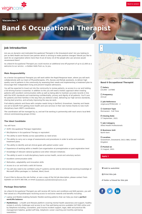 Are you an dynamic and motivated Occupational Therapist in the Gravesend area? Are you looking to join an NHS Health and Social Care partner which is striving to make positive changes? Would you like to work for an organisation where more than 9 out of every 10 of the people who use services would recommend them?