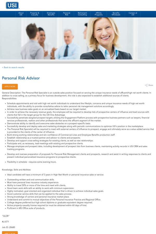 The USI Insurance Services Personal Risk Practice provides comprehensive risk management and insurance consultation to high net worth individuals and family offices with complex financial and insurance needs. The Private Risk Advisor (PRA) is an outside sales position responsible for cultivating relationships with all partners and entities within USI, strategic partners and centers of influence specifically focused on the high net worth and family office marketplace.