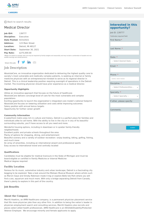 Merritt Hawkins, an AMN Healthcare company, is a permanent physician placement service that fills more physician jobs than any other firm. In addition to being the nation’s leader in physician employment search and consulting services, Merritt Hawkins also recruits and places select allied health professionals. AMN Healthcare is an EEO/AA/Disability/Protected Veteran Employer. We encourage minority and female applicants to apply.
