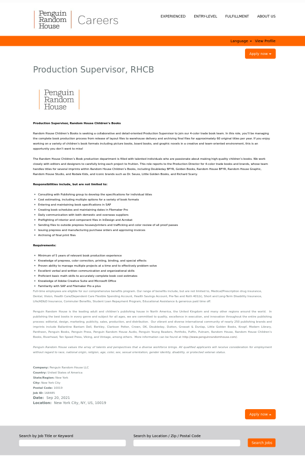 The Random House Children’s Book production department is filled with talented individuals who are passionate about making high-quality children’s books. We work closely with editors and designers to carefully bring each project to fruition. This role reports to the Production Director for 4-color trade books and brands, whose team handles titles for several imprints within Random House Children’s Books, including Doubleday BFYR, Golden Books, Random House BFYR, Random House Graphic, Random House Studio, and Rodale Kids, and iconic brands such as Dr. Seuss, Little Golden Books, and Richard Scarry.