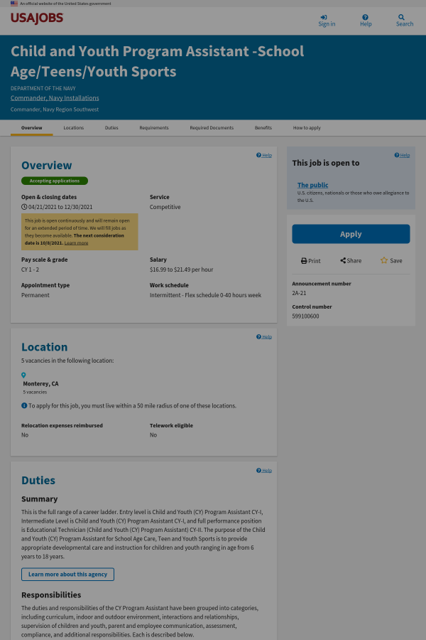 Supervision of Children and Youth - Provides care and supervision, oversight, and accountability for program participants in compliance with the Navy Youth Fitness program and local policies, guidance and standards. Supervises school age, teen, fitness and sports activities and enforces rules and regulations concerning dress, conduct and equipment and game rules. Supervises children and youth during daily schedule of indoor and outdoor activities and on field trips, outings, and special events. Observes program participants for signs that may indicate illness, abuse, or neglect and reports as directed. Incumbent is a mandatory reporter to Family Advocacy and Child Protective Services as prescribed by local policy in the case of suspected incidences of child abuse and neglect.