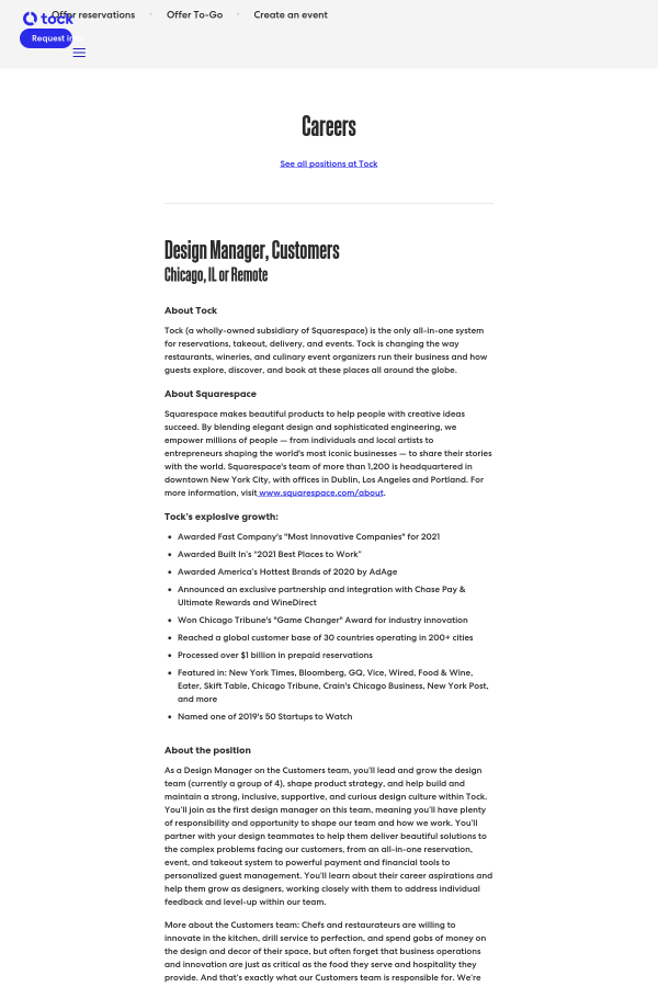 Tock (a wholly-owned subsidiary of Squarespace) is the only all-in-one system for reservations, takeout, delivery, and events. Tock is changing the way restaurants, wineries, and culinary event organizers run their business and how guests explore, discover, and book at these places all around the globe.