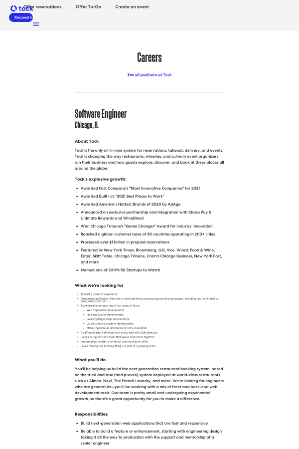 You'll be helping us build the next generation restaurant booking system, based on the tried and true (and proven) system deployed at world-class restaurants such as Alinea, Next, The French Laundry, and more. We're looking for engineers who are generalists—you'll be working with a mix of front and back-end web development tools. Our team is pretty small and undergoing exponential growth, so there's a great opportunity for you to make a difference.