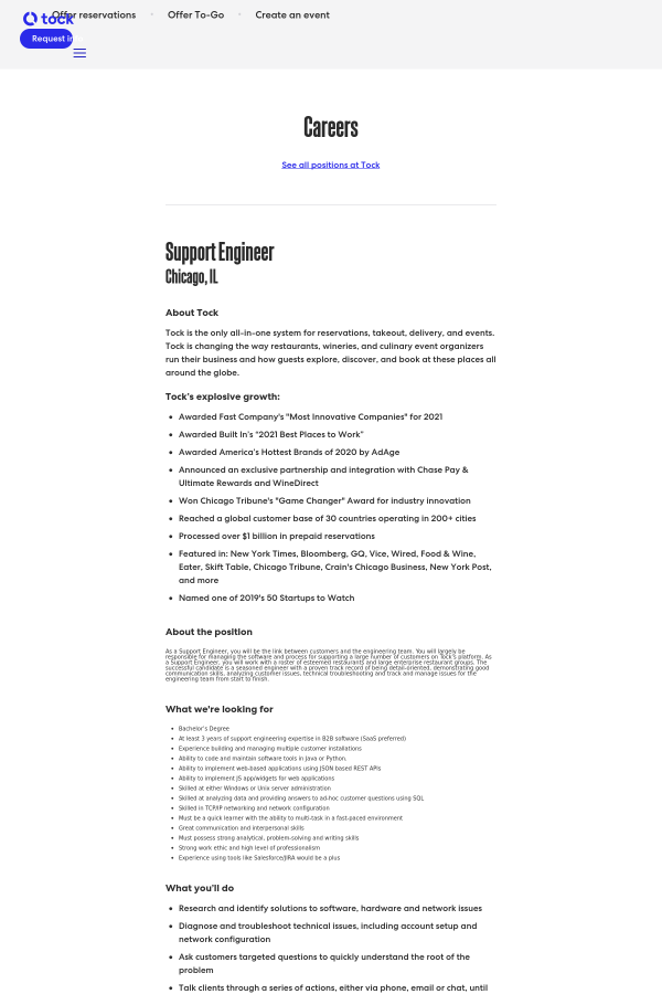 As a Support Engineer, you will be the link between customers and the engineering team. You will largely be responsible for managing the software and process for supporting a large number of customers on Tock’s platform. As a Support Engineer, you will work with a roster of esteemed restaurants and large enterprise restaurant groups. The successful candidate is a seasoned engineer with a proven track record of being detail-oriented, demonstrating good communication skills, analyzing customer issues, technical troubleshooting and track and manage issues for the engineering team from start to finish.