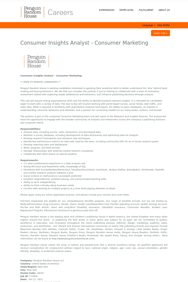 Penguin Random House is seeking candidates interested in applying their analytical skills to better understand the ‘why’ behind book reading and buying behaviors. We ask that you consider this position if you’re looking to collaborate with a team of innovative researchers tasked with exploring reader preferences and behaviors, and influence publishing decisions through analysis.
