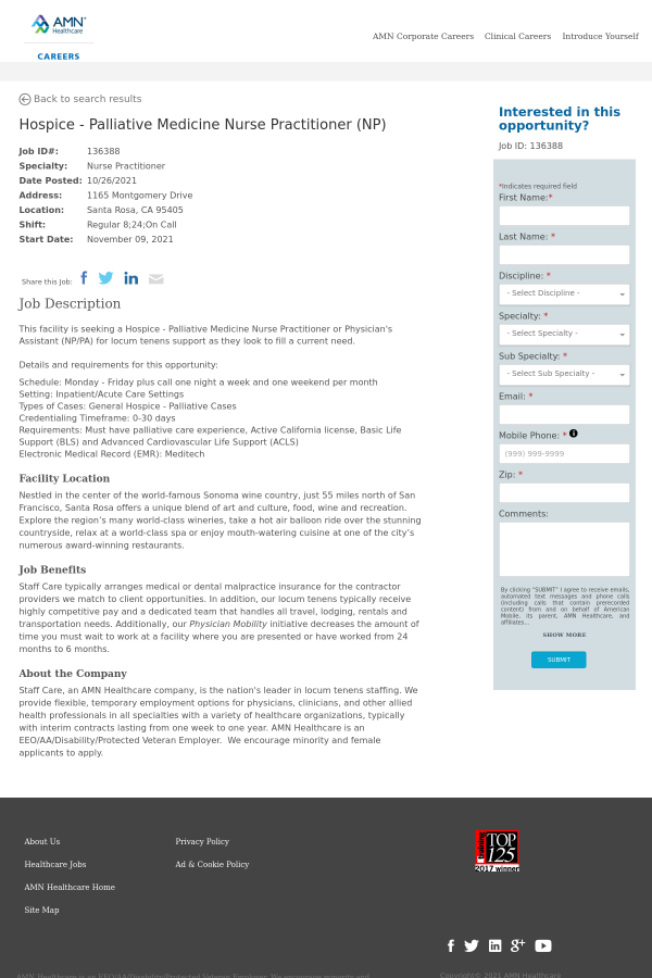 Staff Care, an AMN Healthcare company, is the nation's leader in locum tenens staffing. We provide flexible, temporary employment options for physicians, clinicians, and other allied health professionals in all specialties with a variety of healthcare organizations, typically with interim contracts lasting from one week to one year. AMN Healthcare is an EEO/AA/Disability/Protected Veteran Employer. We encourage minority and female applicants to apply.