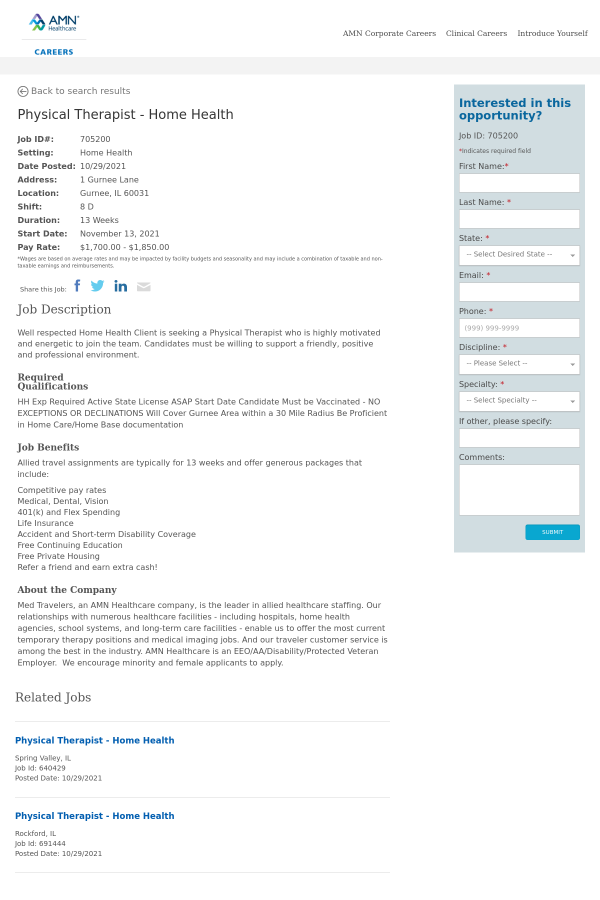 Med Travelers, an AMN Healthcare company, is the leader in allied healthcare staffing. Our relationships with numerous healthcare facilities - including hospitals, home health agencies, school systems, and long-term care facilities - enable us to offer the most current temporary therapy positions and medical imaging jobs. And our traveler customer service is among the best in the industry. AMN Healthcare is an EEO/AA/Disability/Protected Veteran Employer. We encourage minority and female applicants to apply.