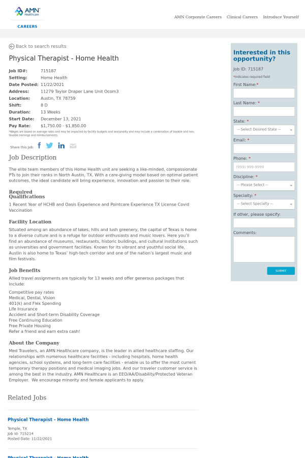 Med Travelers, an AMN Healthcare company, is the leader in allied healthcare staffing. Our relationships with numerous healthcare facilities - including hospitals, home health agencies, school systems, and long-term care facilities - enable us to offer the most current temporary therapy positions and medical imaging jobs. And our traveler customer service is among the best in the industry. AMN Healthcare is an EEO/AA/Disability/Protected Veteran Employer. We encourage minority and female applicants to apply.