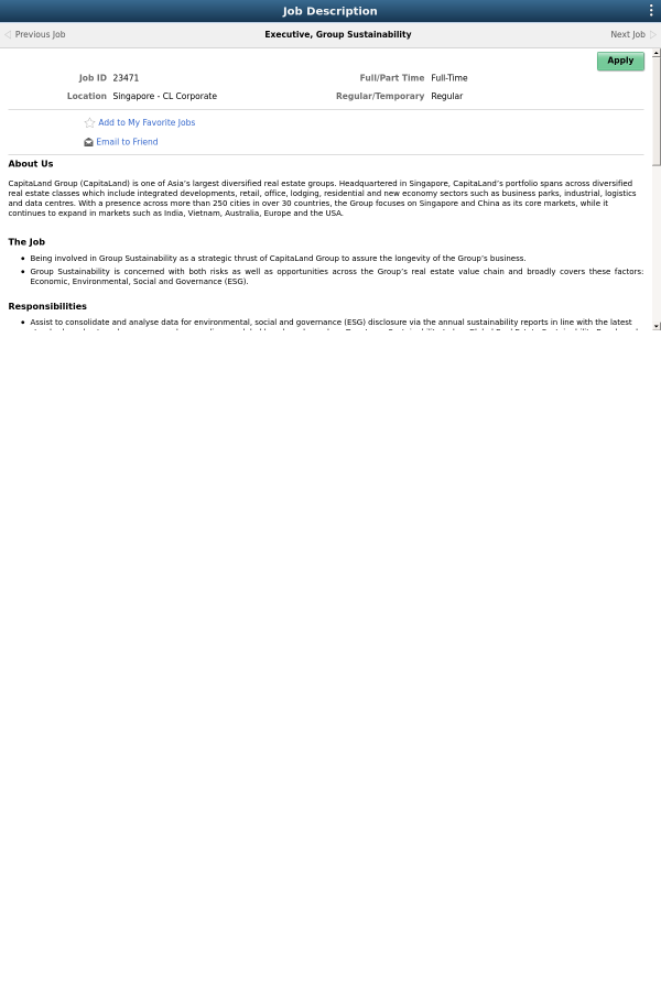 - Being involved in Group Sustainability as a strategic thrust of CapitaLand Group to assure the longevity of the Group’s business.