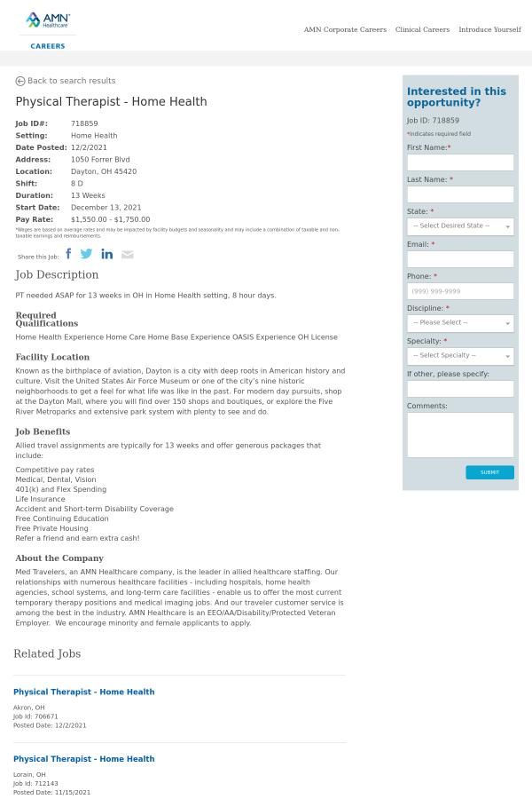 Med Travelers, an AMN Healthcare company, is the leader in allied healthcare staffing. Our relationships with numerous healthcare facilities - including hospitals, home health agencies, school systems, and long-term care facilities - enable us to offer the most current temporary therapy positions and medical imaging jobs. And our traveler customer service is among the best in the industry. AMN Healthcare is an EEO/AA/Disability/Protected Veteran Employer. We encourage minority and female applicants to apply.