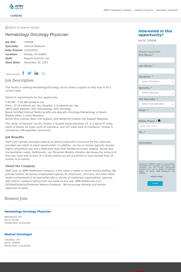 Staff Care, an AMN Healthcare company, is the nation's leader in locum tenens staffing. We provide flexible, temporary employment options for physicians, clinicians, and other allied health professionals in all specialties with a variety of healthcare organizations, typically with interim contracts lasting from one week to one year. AMN Healthcare is an EEO/AA/Disability/Protected Veteran Employer. We encourage minority and female applicants to apply.