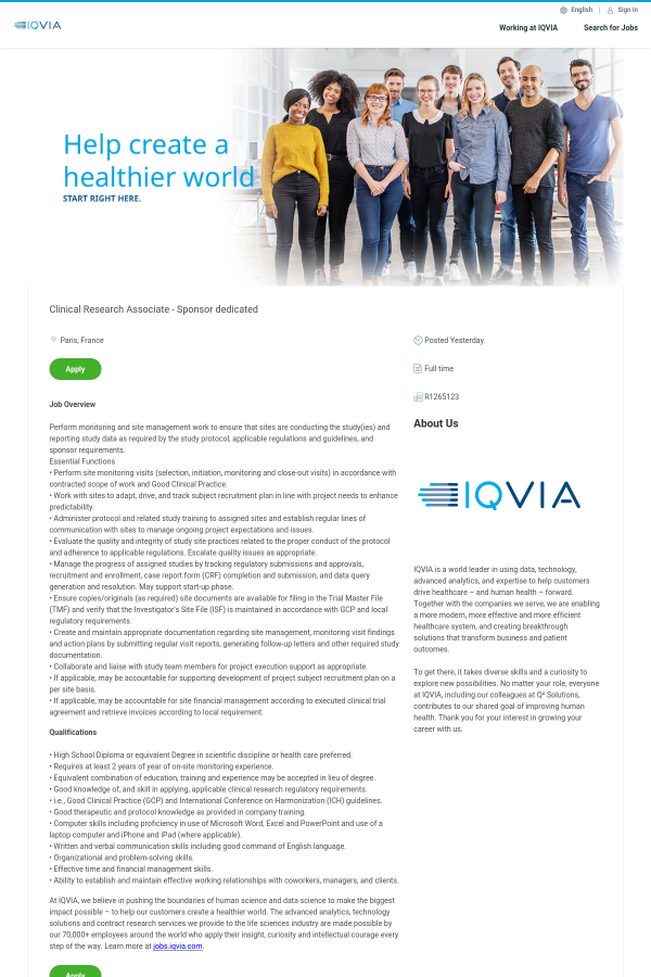 At IQVIA, we believe in pushing the boundaries of human science and data science to make the biggest impact possible – to help our customers create a healthier world. The advanced analytics, technology solutions and contract research services we provide to the life sciences industry are made possible by our 70,000+ employees around the world who apply their insight, curiosity and intellectual courage every step of the way. Learn more at jobs.iqvia.com.