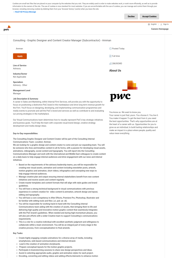 The Consulting Graphic Designer and Content Creator will be part of the Consulting Internal Communications Team. Location: Amman.