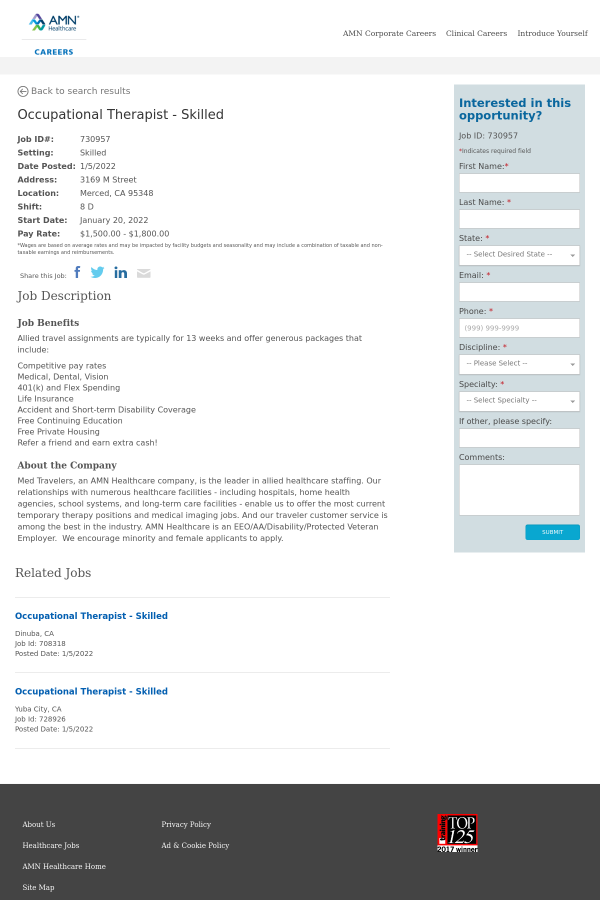 Med Travelers, an AMN Healthcare company, is the leader in allied healthcare staffing. Our relationships with numerous healthcare facilities - including hospitals, home health agencies, school systems, and long-term care facilities - enable us to offer the most current temporary therapy positions and medical imaging jobs. And our traveler customer service is among the best in the industry. AMN Healthcare is an EEO/AA/Disability/Protected Veteran Employer. We encourage minority and female applicants to apply.