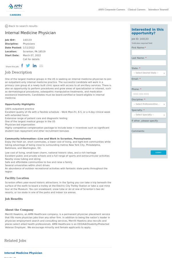 Merritt Hawkins, an AMN Healthcare company, is a permanent physician placement service that fills more physician jobs than any other firm. In addition to being the nation’s leader in physician employment search and consulting services, Merritt Hawkins also recruits and places select allied health professionals. AMN Healthcare is an EEO/AA/Disability/Protected Veteran Employer. We encourage minority and female applicants to apply.
