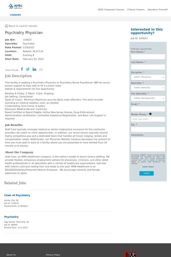 Staff Care, an AMN Healthcare company, is the nation's leader in locum tenens staffing. We provide flexible, temporary employment options for physicians, clinicians, and other allied health professionals in all specialties with a variety of healthcare organizations, typically with interim contracts lasting from one week to one year. AMN Healthcare is an EEO/AA/Disability/Protected Veteran Employer. We encourage minority and female applicants to apply.