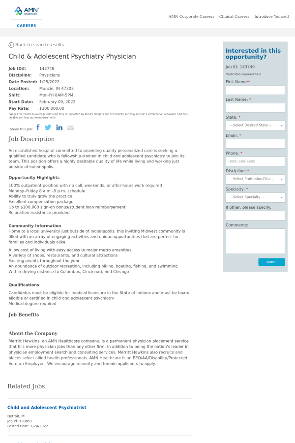 Merritt Hawkins, an AMN Healthcare company, is a permanent physician placement service that fills more physician jobs than any other firm. In addition to being the nation’s leader in physician employment search and consulting services, Merritt Hawkins also recruits and places select allied health professionals. AMN Healthcare is an EEO/AA/Disability/Protected Veteran Employer. We encourage minority and female applicants to apply.